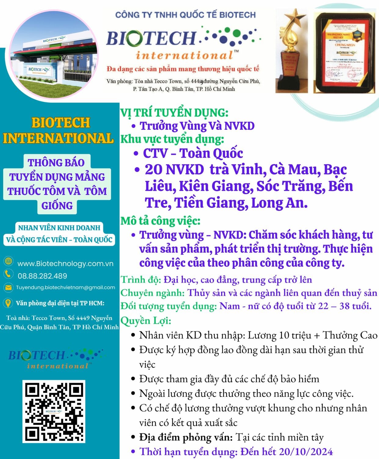 Để đáp ứng nhu cầu phát triển thị trường, Biotech tuyển dụng NVKD cho mảng thuốc thuỷ sản và tôm giống các vị trí như sau