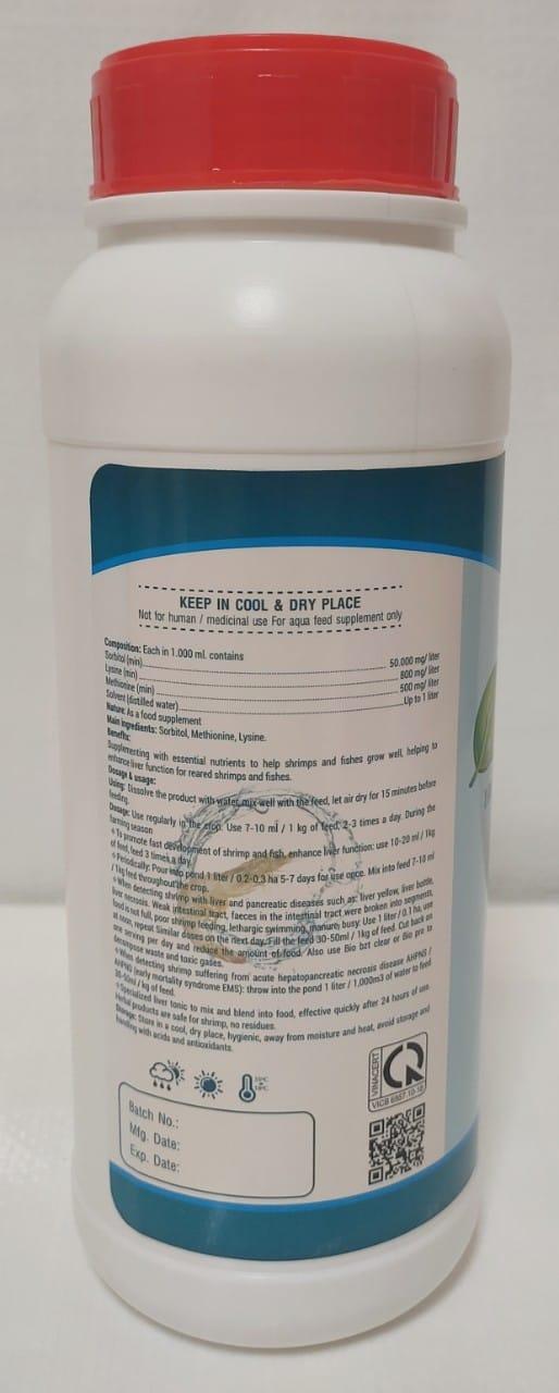 Các chất sorbitol, Lysine và methionine thường được sử dụng trong chế phẩm giúp tăng cường chức năng gan trên động vật thủy sản. Sự hiện diện của các thành phần này trong cơ chế giúp tăng cường chức năng gan loại thải hiệu quả các chất độc ra khỏi cơ thể và duy trì các hoạt động chức năng ở mức bình thường, giúp động vật thủy sản nuôi sinh trưởng và phát triển nhanh, duy trì tình trạng sức khỏe tốt và ít bệnh.