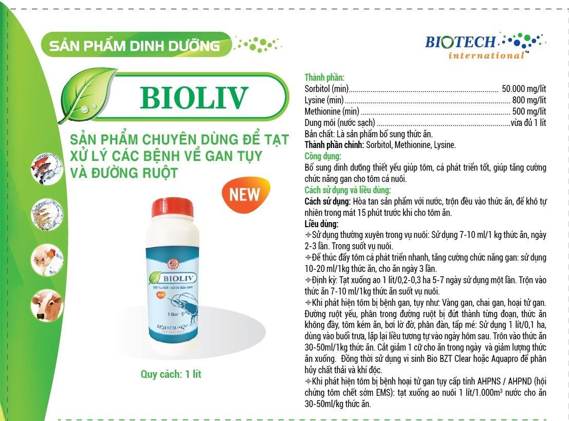 Bioliv new là sản phẩm dinh dưỡng dạng nước được chiết xuất từ thảo dược. Bổ sung dinh dưỡng thiết yếu (Lysine, Methionine, Sorbitol) giúp cá phát triển tốt, giúp tăng cường chức năng gan cho cá nuôi.