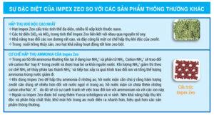 Vì sao impex zeo lại giúp giảm khí độc nhanh: Vấn đề này nắm ở cơ chế và thành phần của Impex zeo. Trong ao nuôi tôm, cá ammonia rất cao do chất thải. Thường tồn tại ở dạng ion NH4+ và phân tử NH3. Cation NH4+ sẽ trao đổi với cation Na+ hay K+ trong Impex zeo và được loại bỏ ra khỏi nguồn nước. Trong thành phần Impex zeo còn được bổ sung Yucca schidigera và Probiotic + Al2O3 nên khí độc giảm rất nhanh.