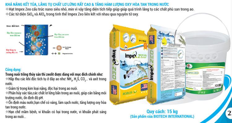 Impex zeo là sản phẩm được kết hợp đặc biệt giữa Vi sinh + Yucca schidigera + Zeoline chuyên dùng để xử lý ao hồ trong nuôi trồng thủy sản. giúp làm sách nước và đáy ao, lắng tụ chất lơ lững, chất hữu cơ và làm giảm khí độc trong ao nuôi, giúp môi trường ao nuôi sạch hơn, tôm cá phát triển nhanh.