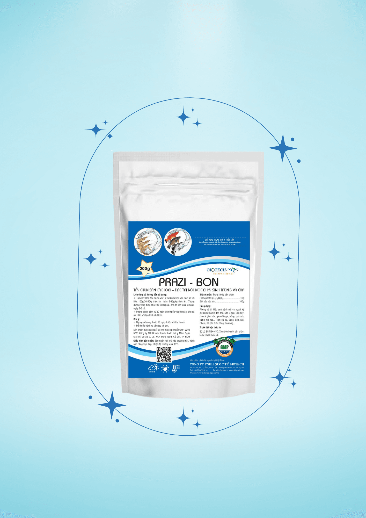 PRAZI- BON (Prazi quan tel) :Prazi quan tel là loại kháng sinh chuyên đặc trị các bệnh về nội ngoại ký sinh trùng trên tôm, cá và gia súc, gia cầm. Giúp cơ thể tôm, cá đào thải giun, sán, ký sinh trùng ra khỏi cơ thể qua đường tiêu hóa.