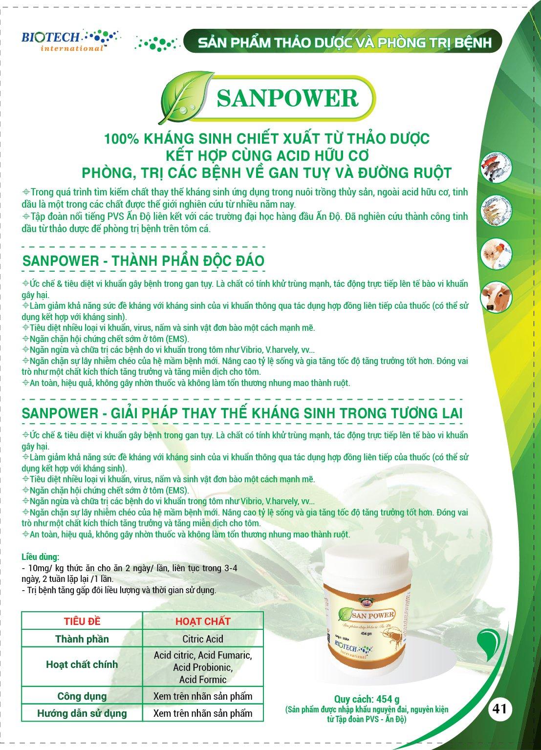 SANPOWER là một loại dinh dưỡng hữu cơ được tổng hợp từ Tinh dầu chiết xuất từ thảo dược kết hợp với các acid hữu cơ như: Acid citric, Acid Fumaric, Acid Probionic, Acid formic, giúp quá trình phòng trị bệnh trong nuôi trồng thuỷ sản đạt hiểu quả, là giải pháp thay thế kháng sinh trong tương lại. SANPOWER cung cấp acid hữu cơ cải thiện hệ tiêu hóa. Giúp tôm, cá tăng trưởng tốt.
